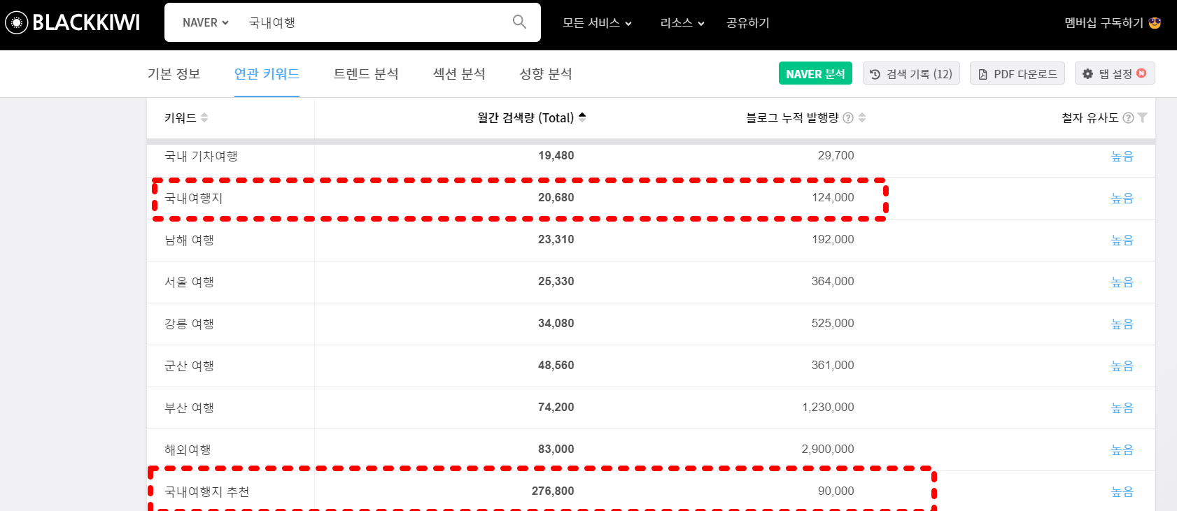 같은 방법으로 국내여행지 추천 키워드를 분석해봅니다. 그럼 이제 어떤 키워드로 쓰셔야 할지 보이시나요? 이렇게 블랙키위를 사용해서 블로그 키워드 분석을 반복적으로 해봅니다. 그러면 블로그 키워드 추출이 점점 쉬워지실 겁니다.