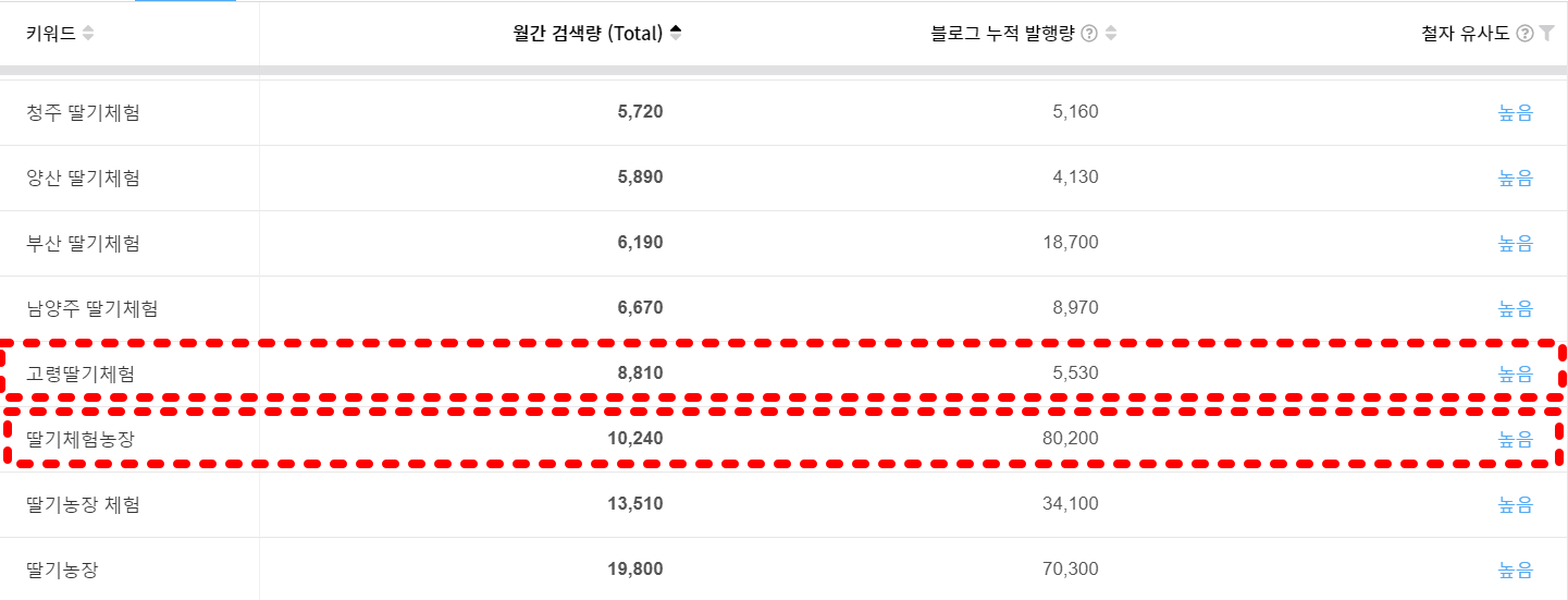 그러면 딸기체험과 관련된 연관 키워드들이 나오고 그의 월간 검색량과 블로그 누적 발행량이 나옵니다. 아래에 보면 고령딸기체험은 월간 검색량이 8,810건 이고 블로그 글의 수는 5,530개 입니다. 즉, 검색량이 발행량보다 많다는 것을 알 수 있습니다. 반면, 딸기체험농장 이라는 키워드의 검색량은 10,240건이고 블로그 누적 발행량은 80,200개 입니다. 검색량보다 발행량이 8배는 더 많은 것을 보실 수 있습니다. 즉, 딸기체험농장을 키워드로 글을 쓰면 상위 노출이 거의 불가능하다고 생각하시면 됩니다. 블랙키위 블로그 키워드 프로그램을 사용하면 고령딸기체험에 대해 글을 쓰는 것이 딸기 체험보다는 더 노출될 가능성이 높다는것을 알 수 있습니다.