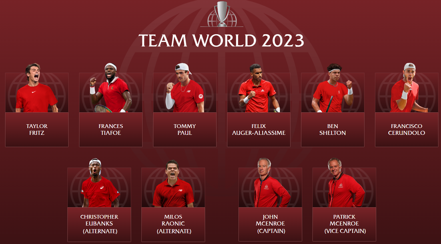 팀 월드는 유럽 국가를 제외한 나머지 국가들의 프로 테니스 선수들을 모아 이루어진 팀입니다. 여기에는 테일러 프리츠, 프란체스 티아포, 토미 폴, 펠릭스 어거 알리아심, 벤 쉘튼, 프랜시스코 세룬돌로 선수가 포함되어 있습니다.