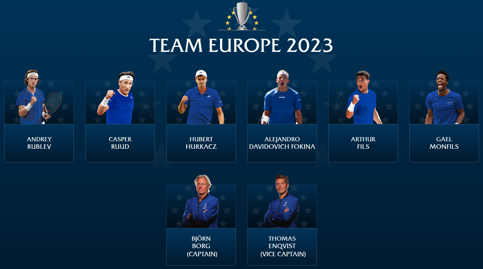 유럽 국가들을 대표하는 프로 테니스 선수 6명으로 이루어진 팀 유로에는 안드레이 루블레프, 캐스퍼 루드, 휴벌트 후르카츠, 알레한드로 다비도비치 포키나, 아서 필스, 갤 몽필스 선수가 있습니다.